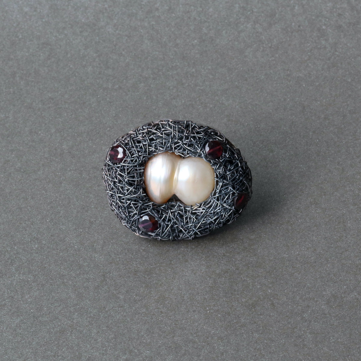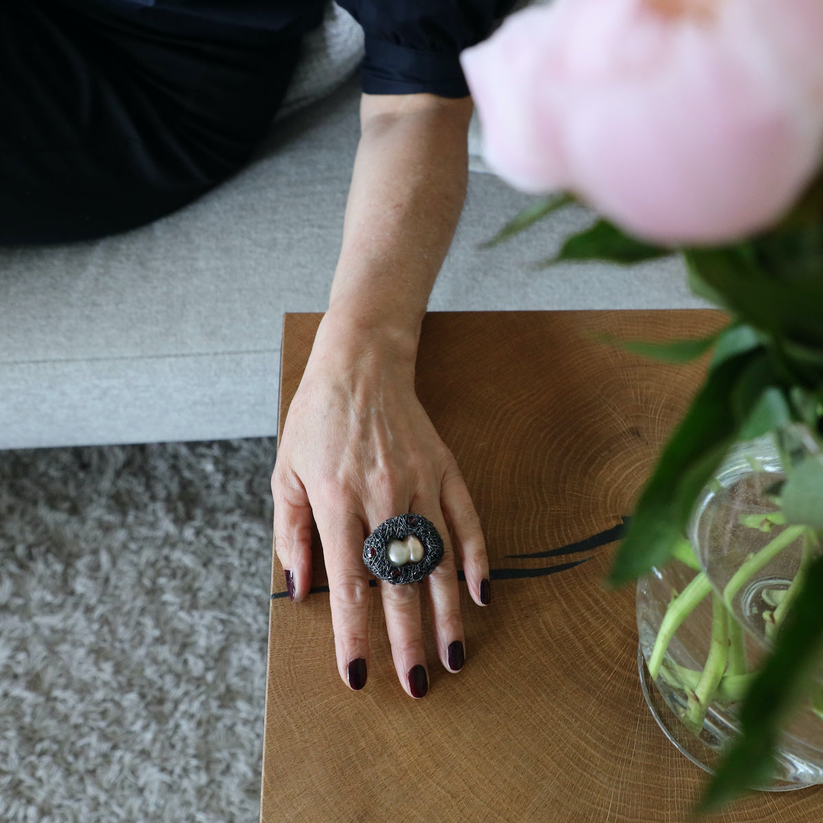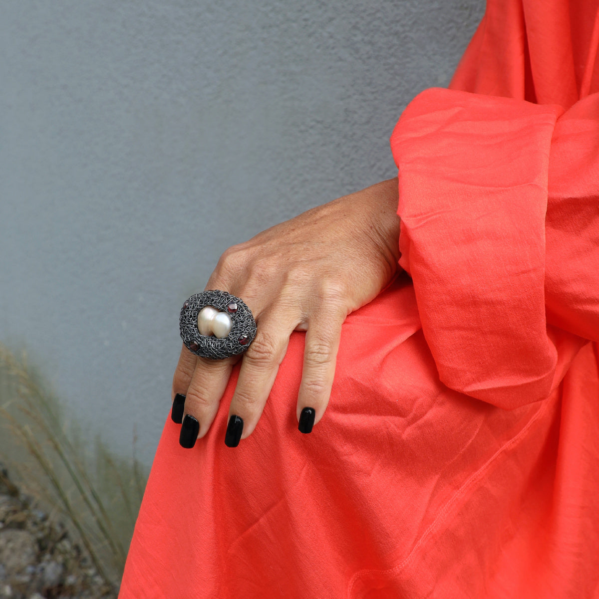 "Nessa"... is deeply luscious. A blackened silver, deep burgundy red and pearl ring! One-of-a-kind and excitingly different as a pearl ring, individually created by Sheila Westera, whose signature style is highly recognisable because she invented the technique in which she works, allowing her to shape and feel each structure. She creates with her hands and handpicks each stone or pearl for any creation, led by her mood or vibe of the day.