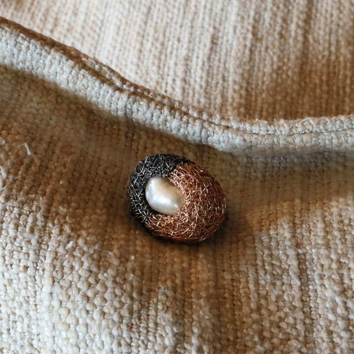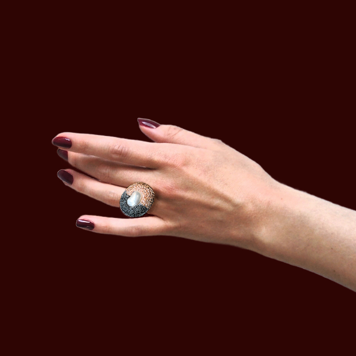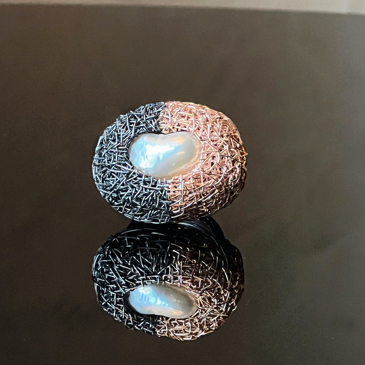 "Yael"... is a new more edgy pearl ring. This more moderately sized pearl ring is a feisty beauty, in an unusual colour combination and design, where one part is made of rose gold and the other part of blackened silver, holding a wonderful lustrous pearl in its centre.