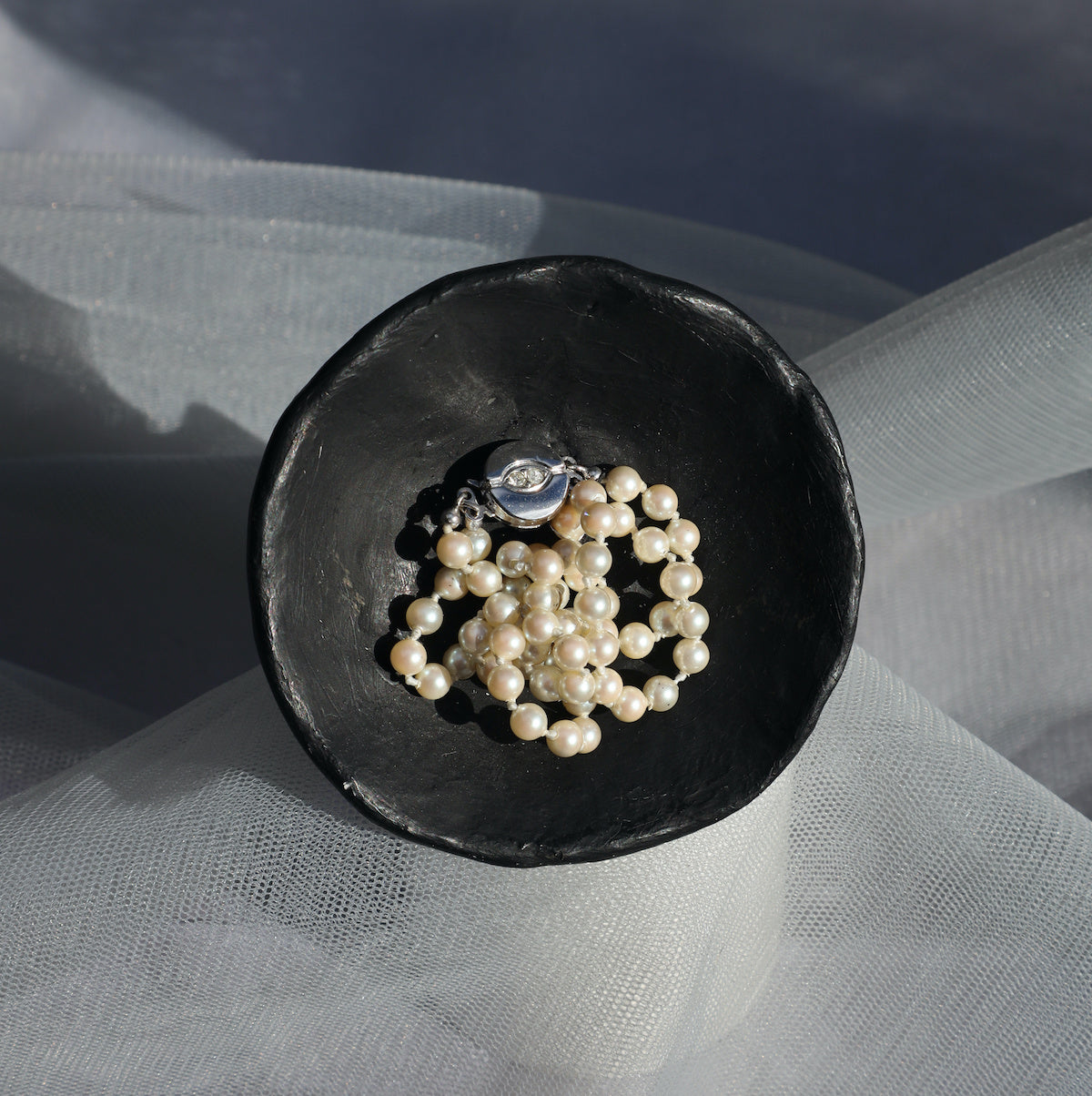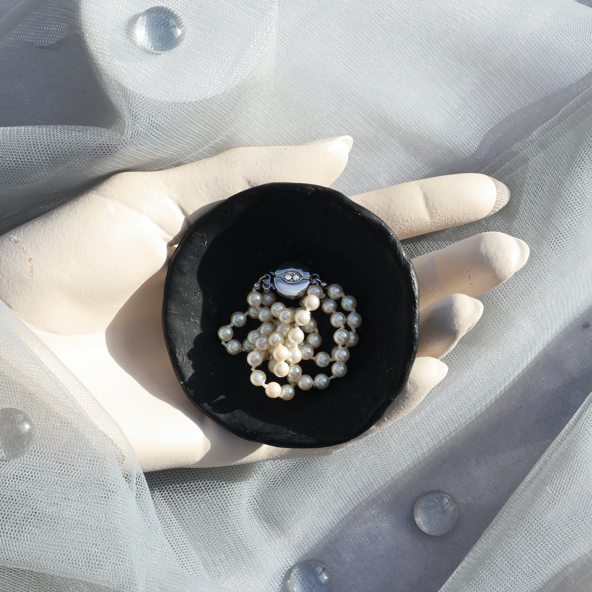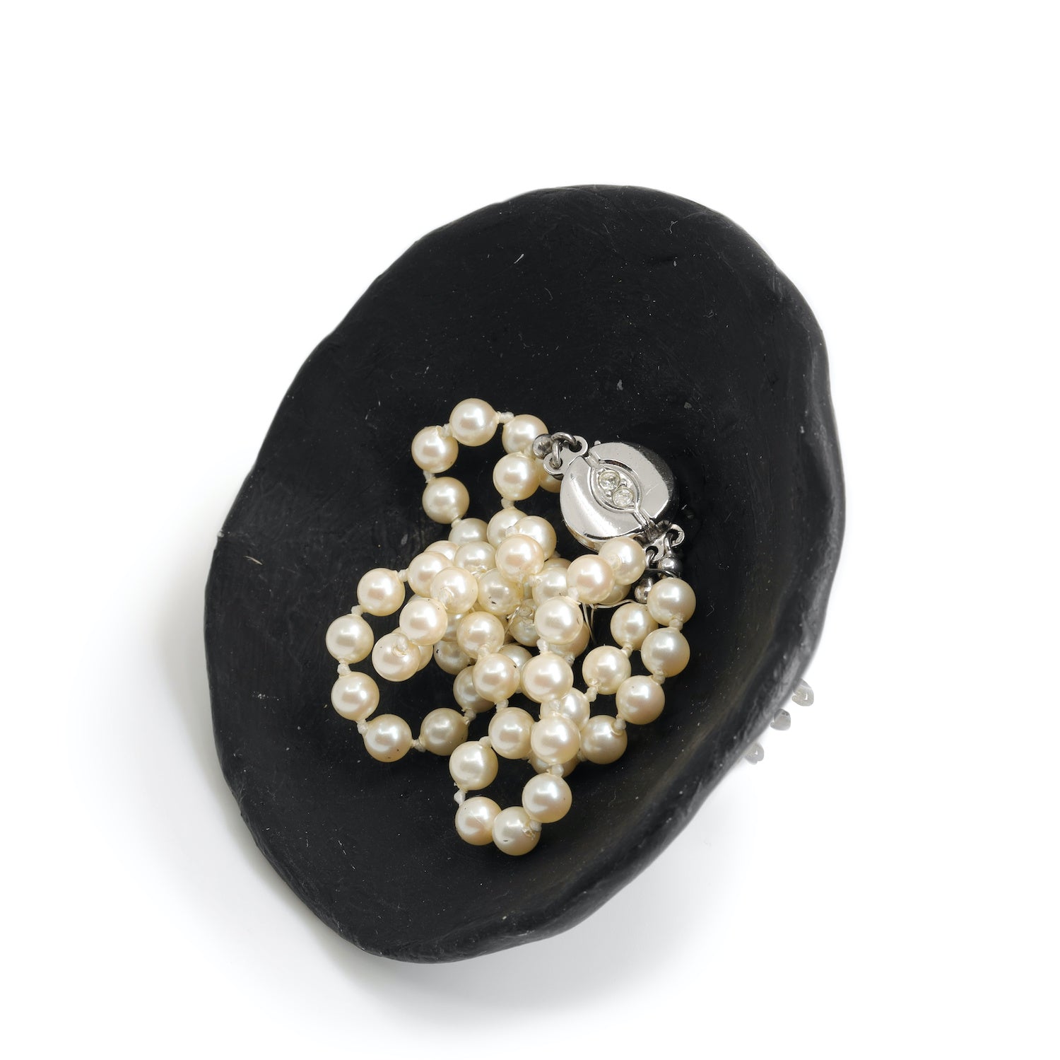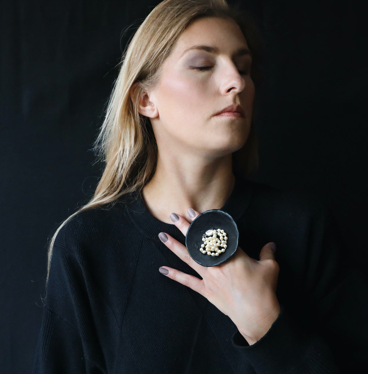 Ring "No Promise".. is part of a series of seven rings, created for the Exhibition 'The Living Trace" in London. This particular ring explores the quiet weight of inherited objects and the found freedom when letting go, which I have explored in three rings as part of the first fase expressed in "Holding On" for this particular exhibition. This saucer ring comes with a pearl bracelet that I never wore. Gifted by family, it lay on a saucer for decades in my drawer. I never promised to wear her, but I did hold on to the memories for a long time. Now, she is ready for a new life.