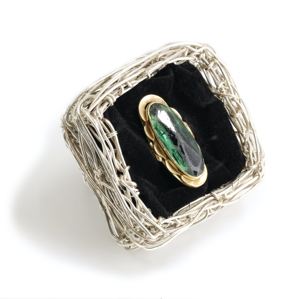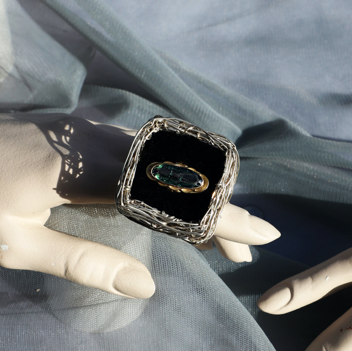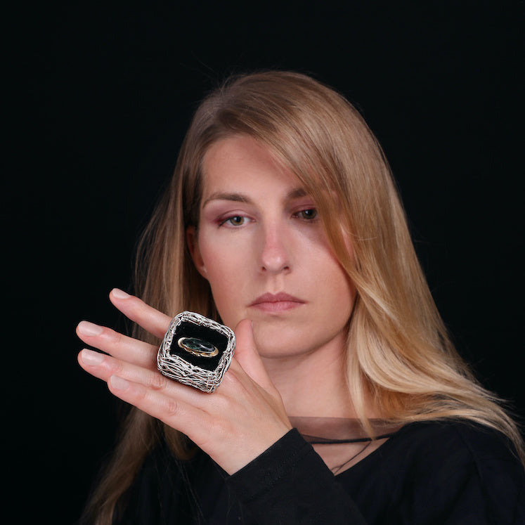 Ring "Cocktail Time" A golden ring sitting in a box, made of short challenging silver remnants, which I deliberately left raw and relatively unfinished, because beauty doesn't need to be polished. In it, is a ring from a family member, heavily damaged after being worn. She now has a new life as a Cocktail ring and ready to shine again. Using the small silver pieces to create the silver box, is because sustainability has been engrained in me since I was 17. This is the last ring of three in where I'm expressing the theme Holding On. The Living Trace  exhibition in London is where I showed her for the first time.