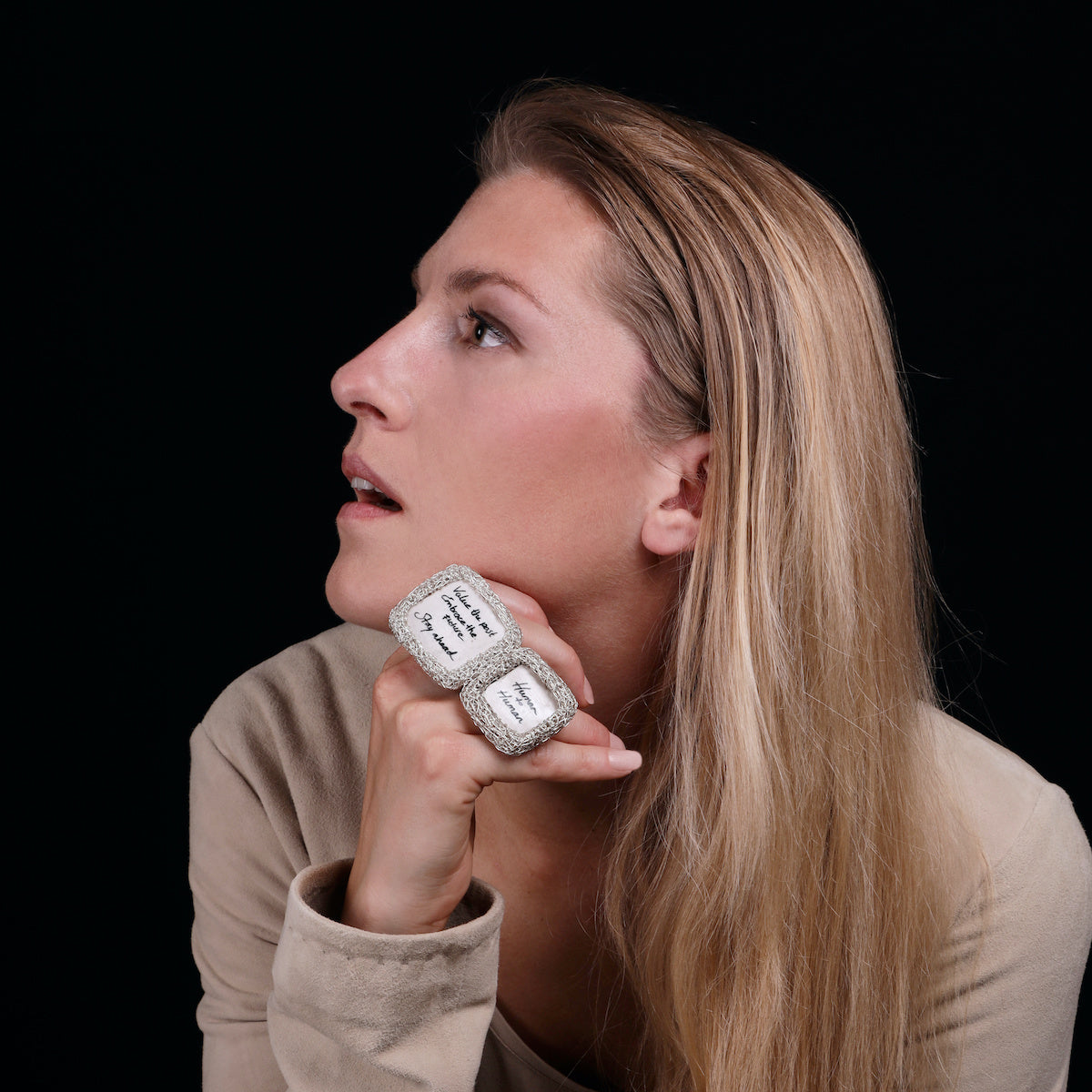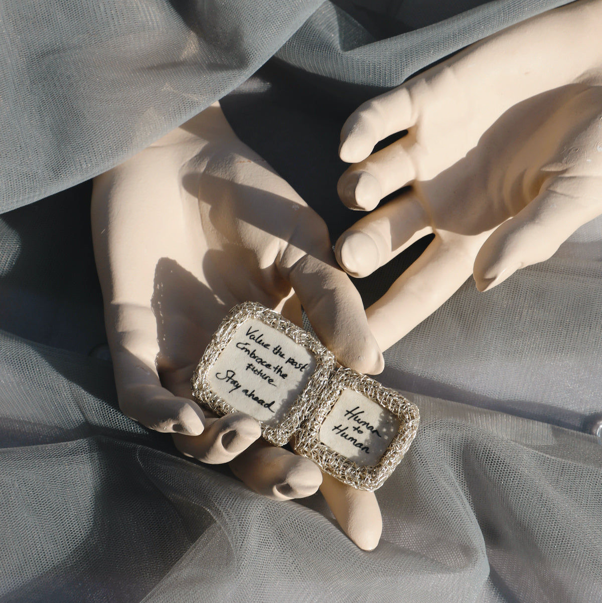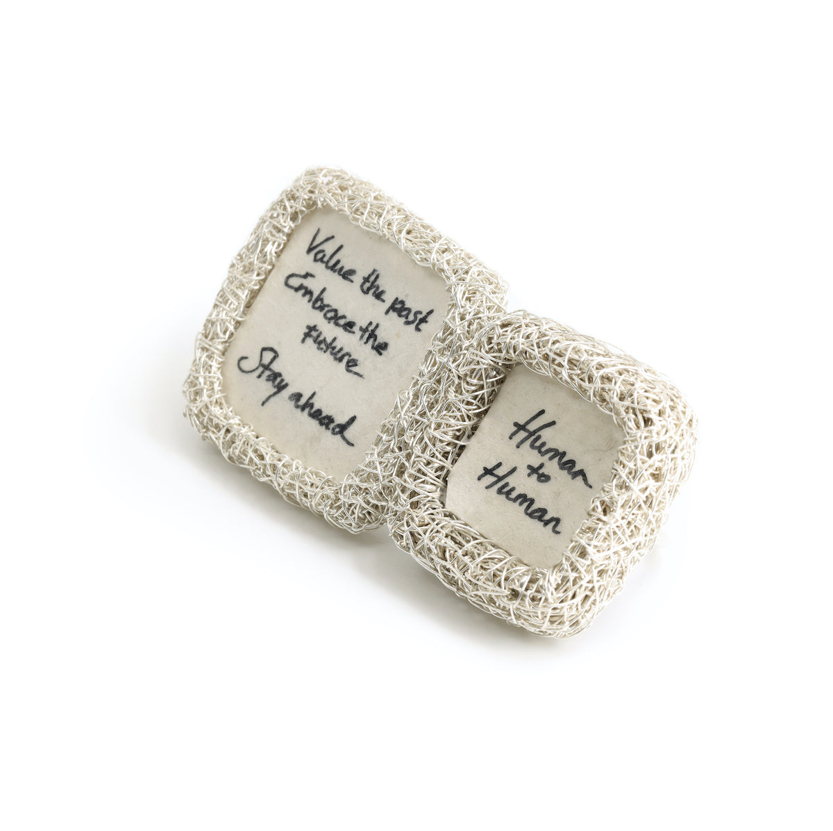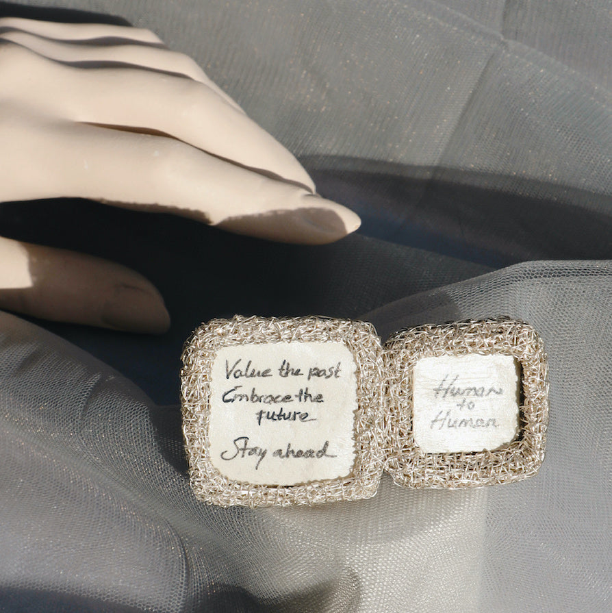 Towards the last phase of the series, I wanted to communicate again, in search of a change. In two rings I'm reaching out. Ring "Just saying", comes with handwritten messages on parchment, that are meant to attract people that seek a certain communication too. This conversation starter is to spark debate with strangers, because ideas should be exchanged, and face-to-face connection matters more than ever. Made from silver remnants I was about to melt, re-using fine wire from a jewel that never saw the light of day. A more polished finish this time, but still rooted in sustainability and transformation.