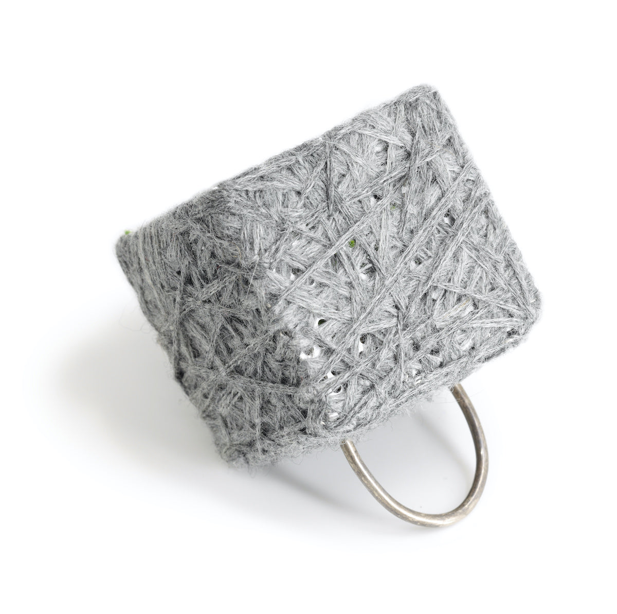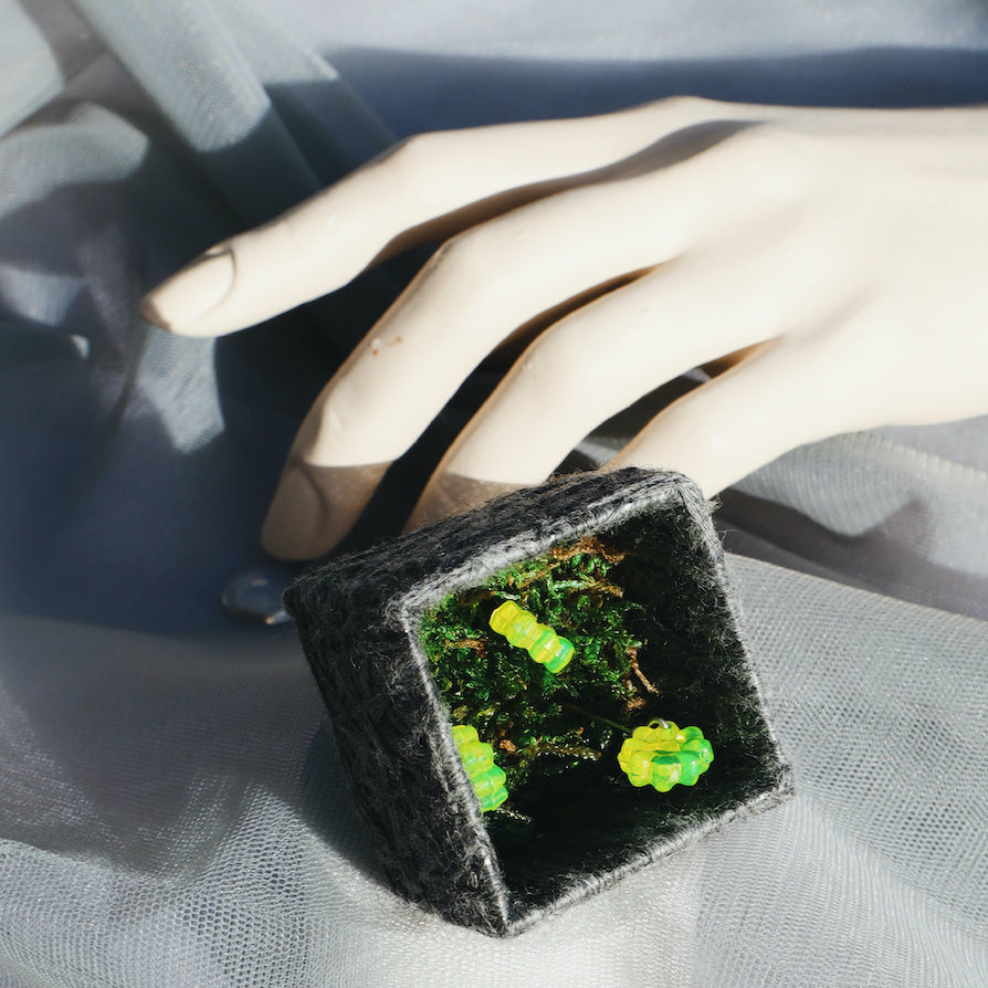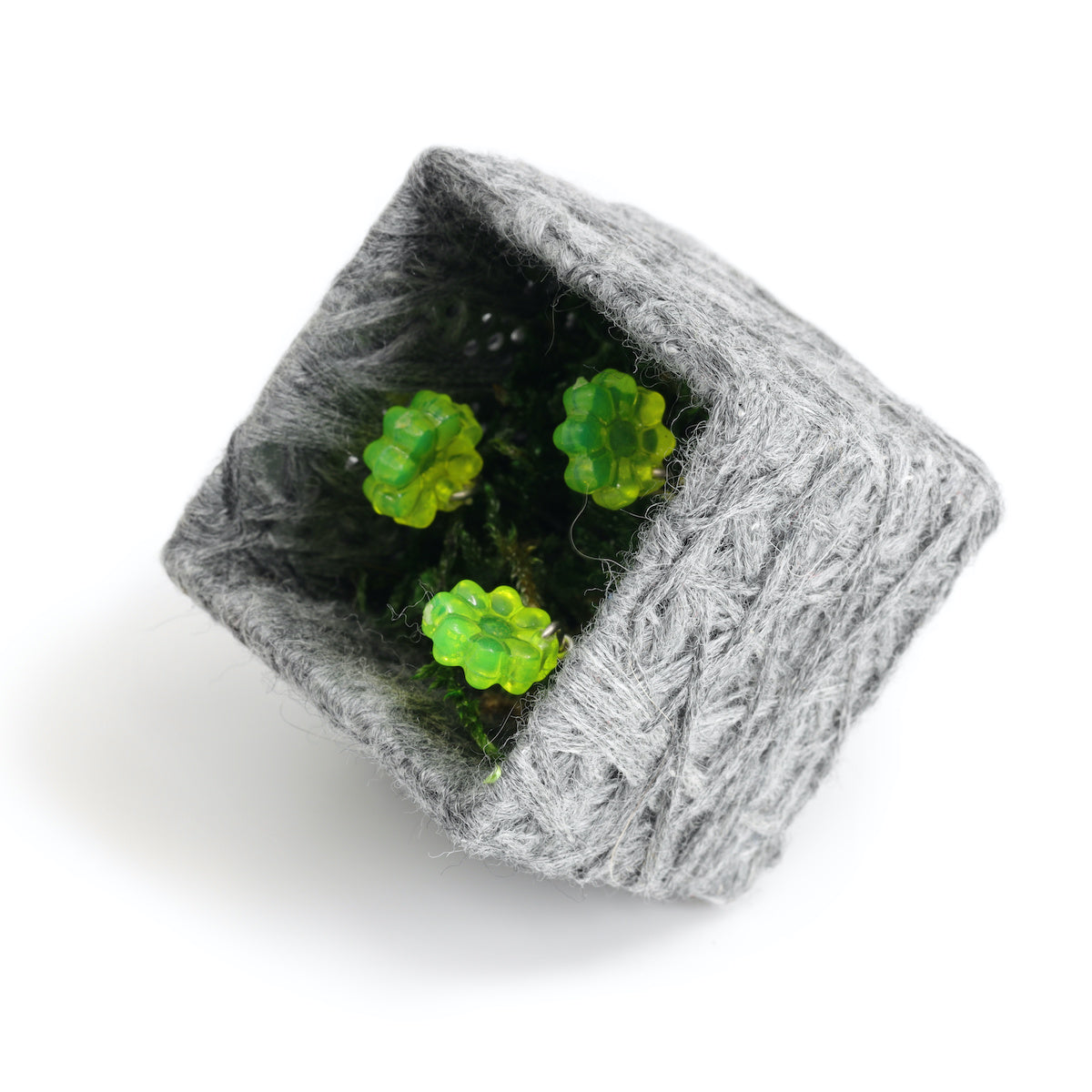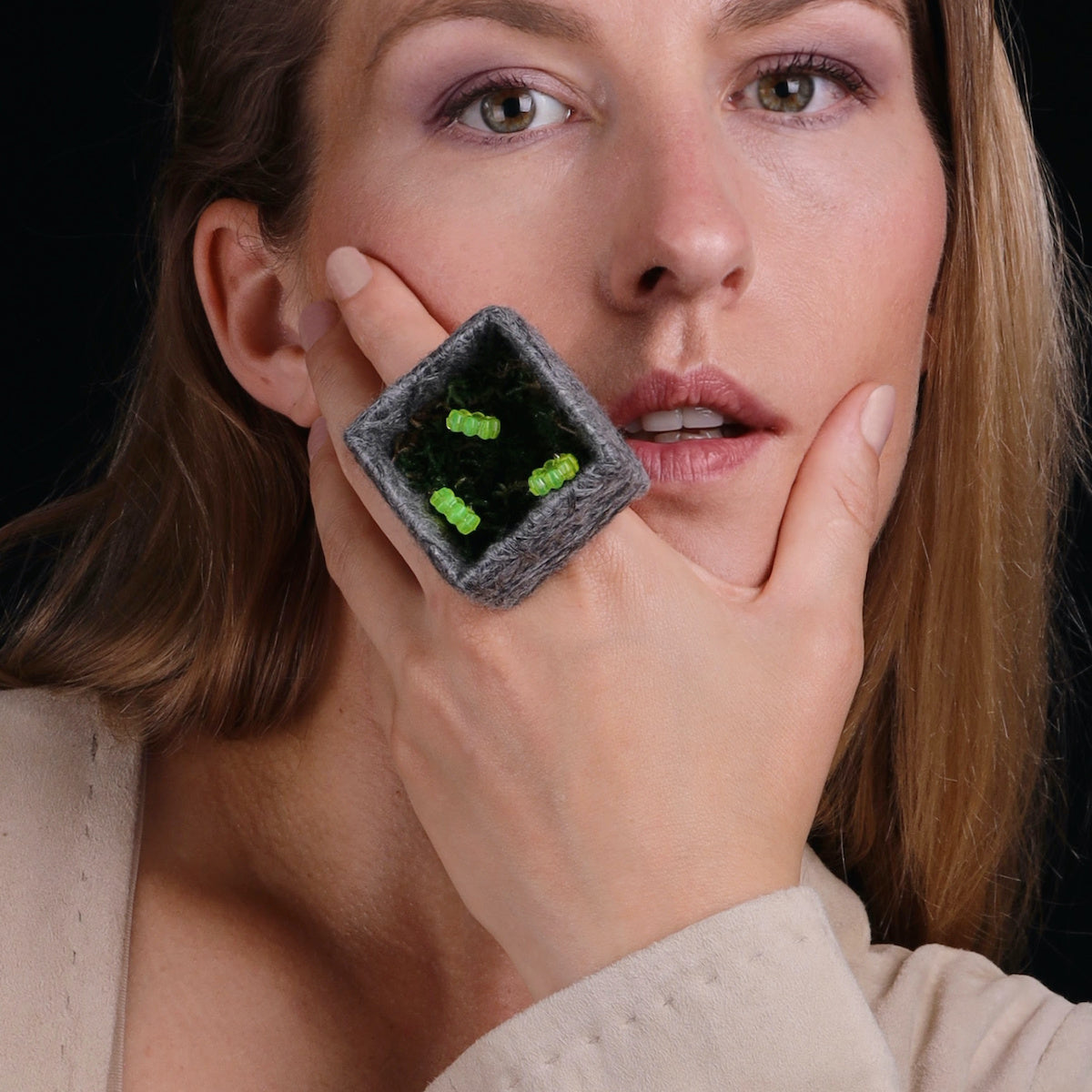 Ring "Genesis".... With this ring, Sheila Westera asked herself the question, how we as human beings deal with the near future, and that of technology and Ai. Her conclusion was that we should not fear the future but learn to embrace her, as over the last centuries we had many inventions, that were feared, yet we all came to adapt and embrace them in the end. This square shape relates to a more futuristic design, yet, it is laced with vintage things, as wool and plastic neon flowers, on dried moss, thinking that if we plant a seed, a new life will start to take place, making it more of a beginning than an ending. She believes that artists, artisans or craftspeople will always be valued. In an increasingly digital world, the human factor becomes more precious, not less. There's something about individual thought processes and handiwork that gives life deeper meaning—something that can't be digitised or automated. This is genesis—a reminder that as we move forward, we carry with us the irreplaceable value of the human mind, touch, and soul. The last jewel in a series of seven jewels, created for the "Living Trace" exhibition, at Cluster Contemporary Jewellery in London, 2025.