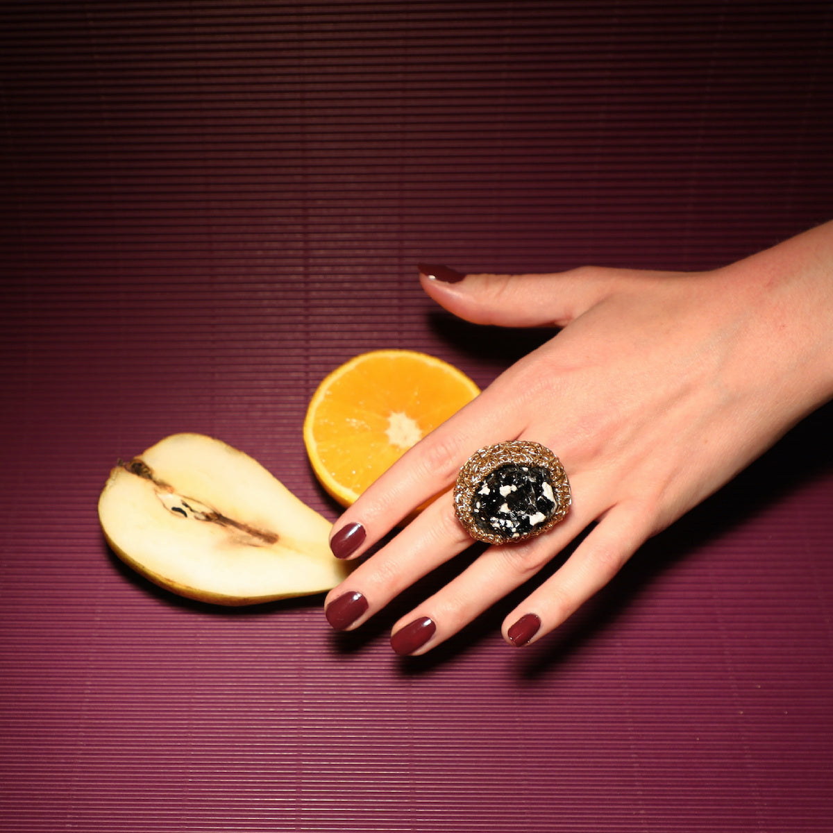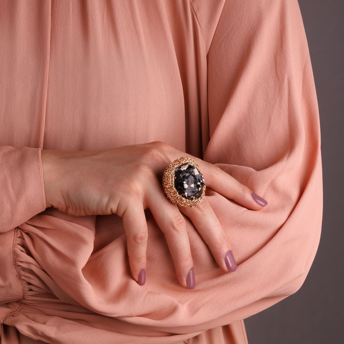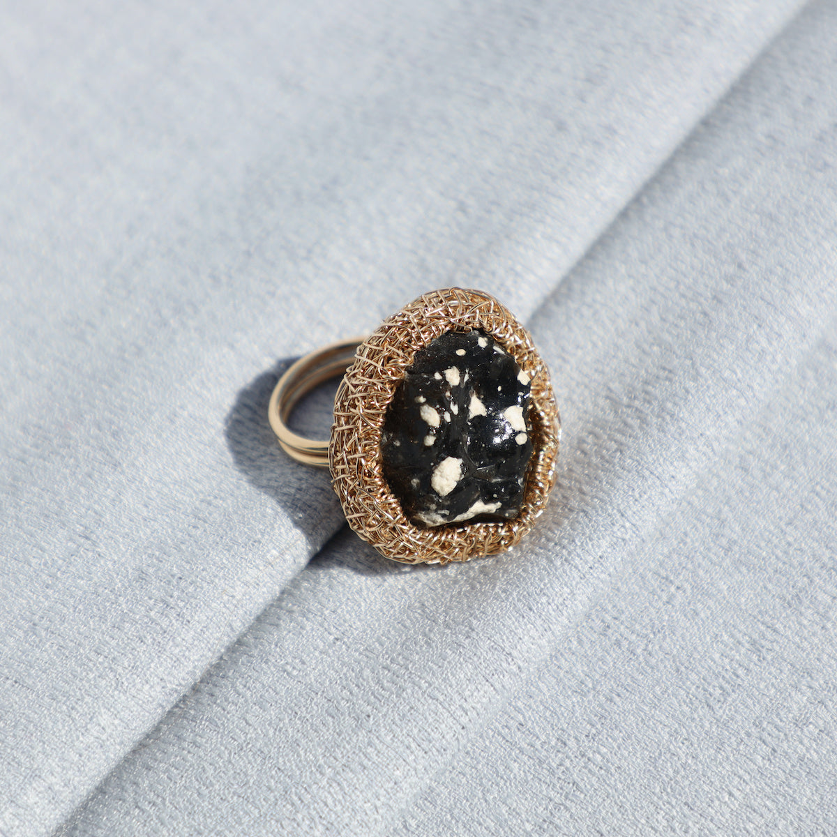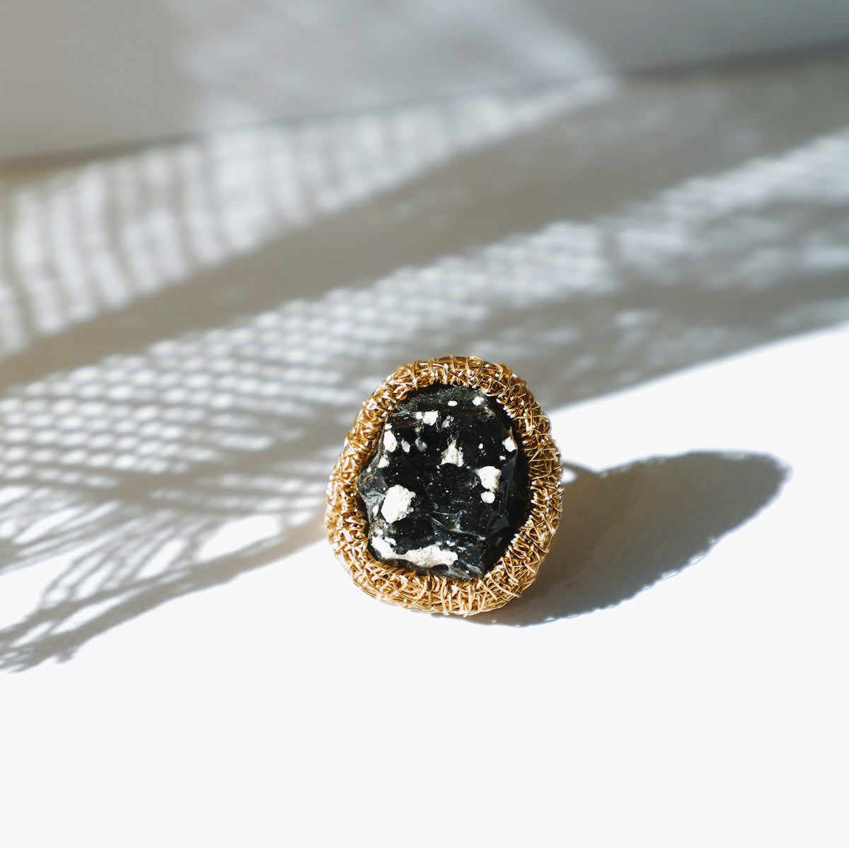 Zelda... One-of-a-Kind Raw Obsidian Ring, a striking, one-off ring built around a beautiful chunk of raw Obsidian, sprinkled with white speckles. She’s got a pure, minimal vibe, but don’t be fooled—there’s heaps of character here. Like all of Sheila’s jewels, Zelda is truly unrepeatable. Sheila only works with stones that speak to her, and she’s never been one for repetition—each creation is a fresh adventure, driven by the individuality of every stone. This stone ring comes with a pure vibe, and is a natural showstopper bold and minimal at the same time. Sculpted by Sheila’s in her own techniques, making her a celebration of raw beauty and understated elegance, straight from the Swiss Alps, with Sheila’s signature touch.